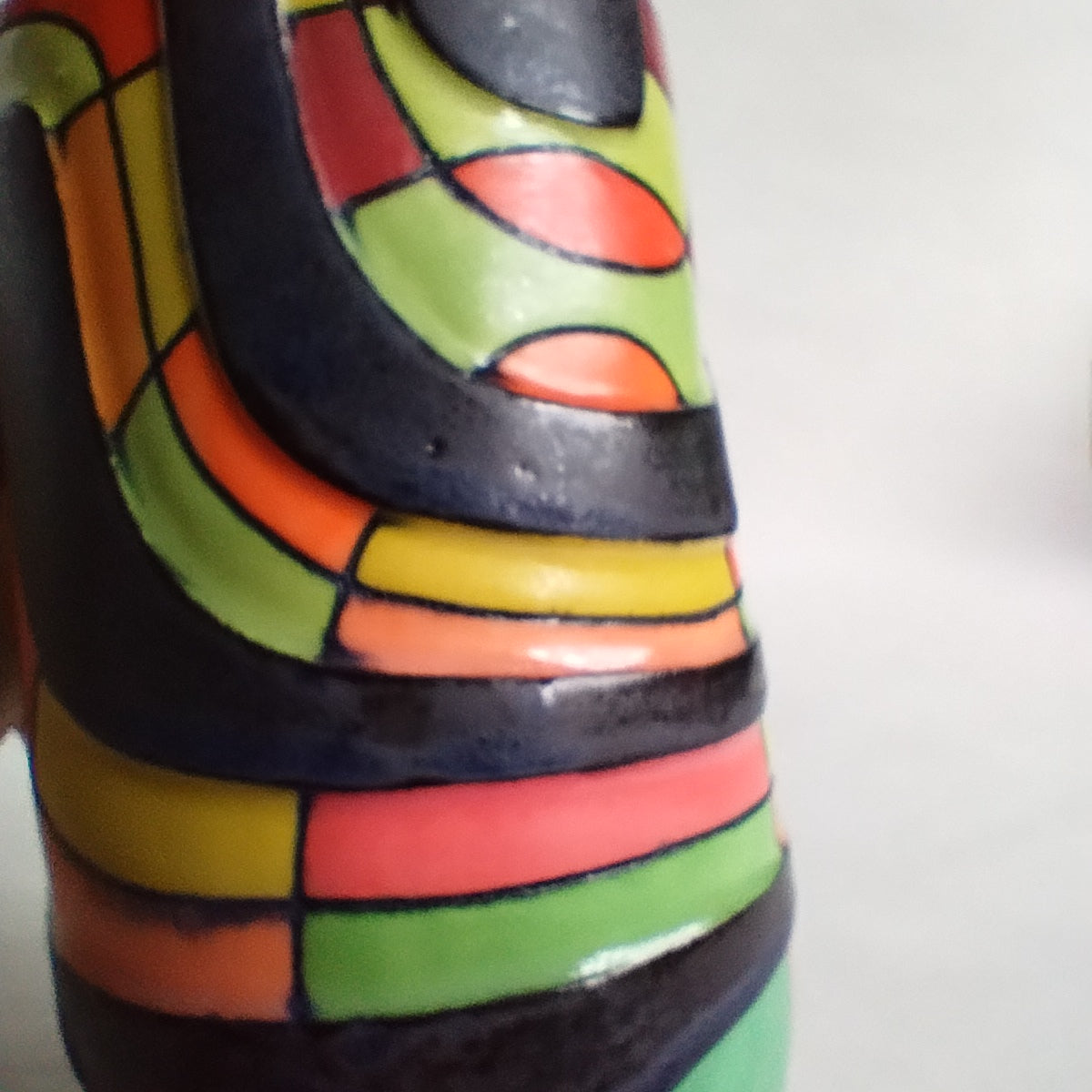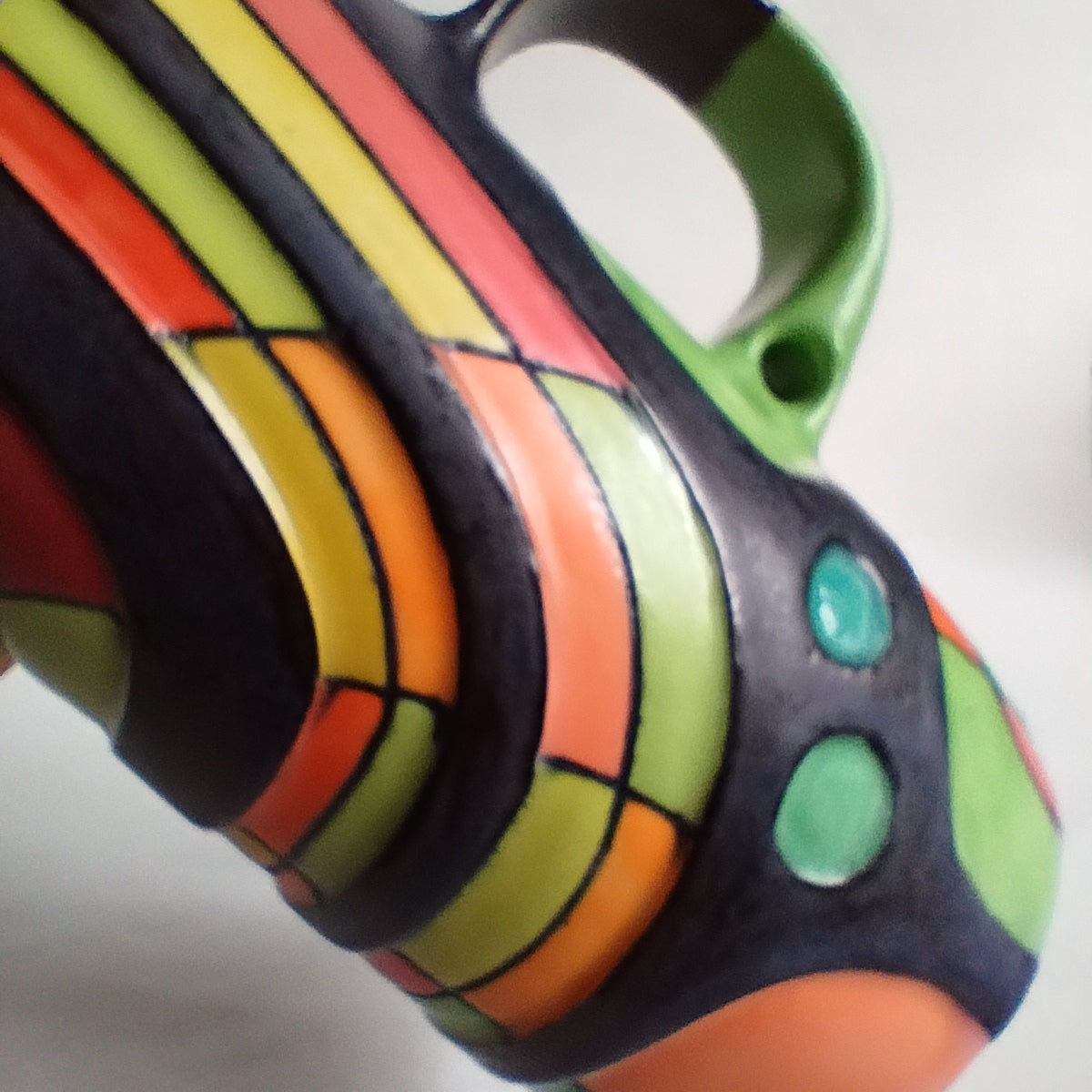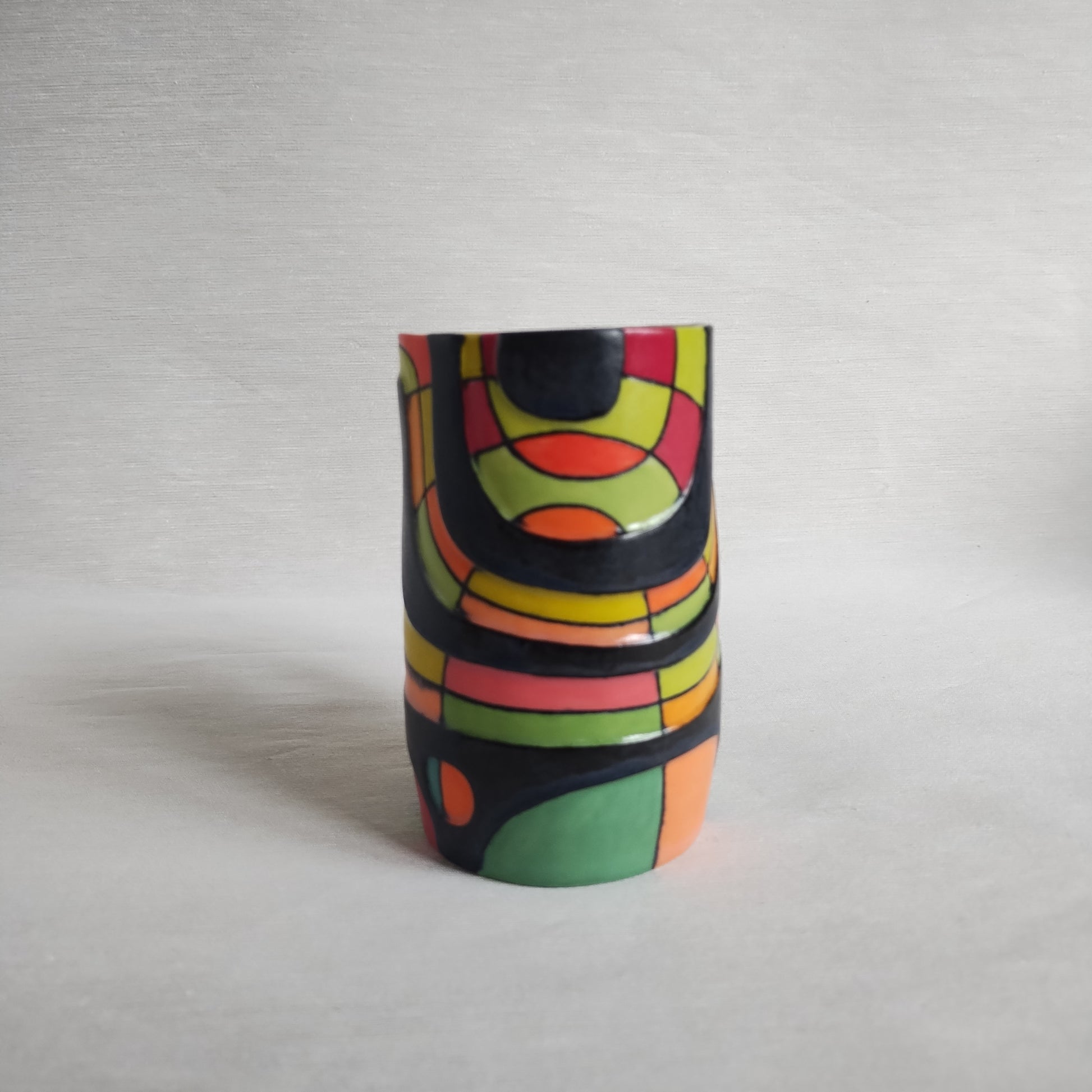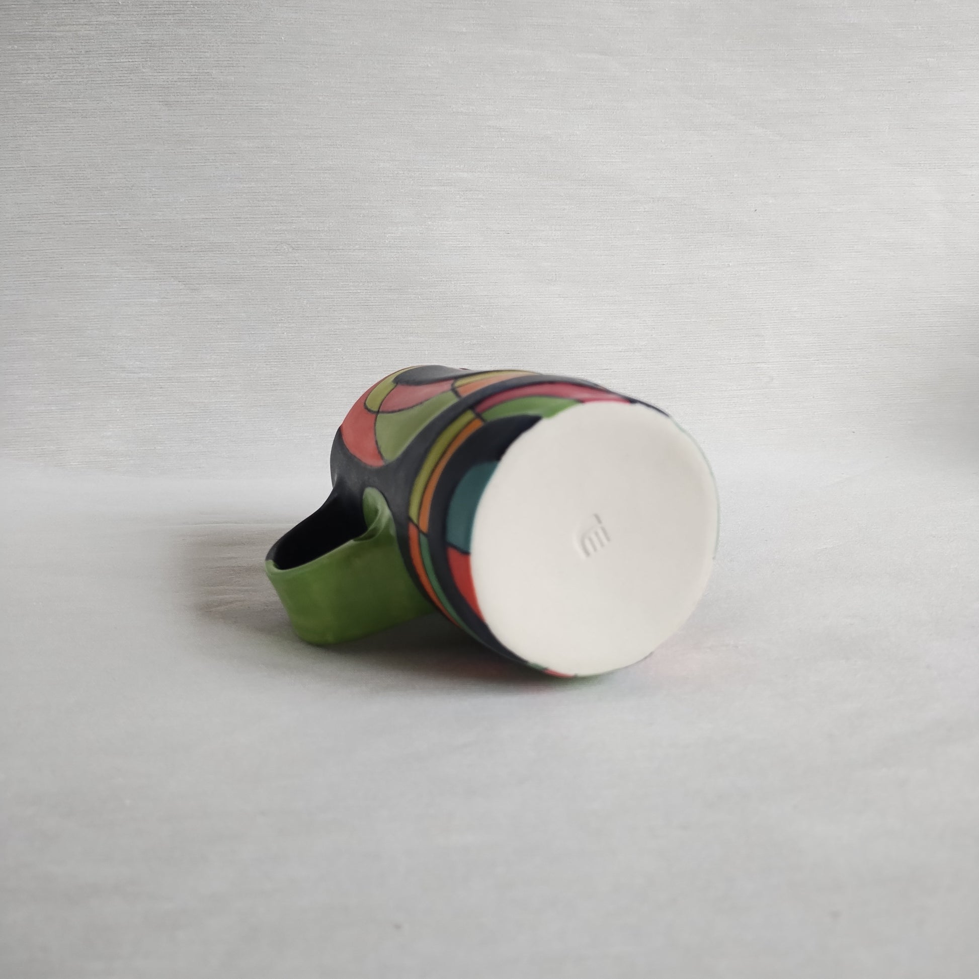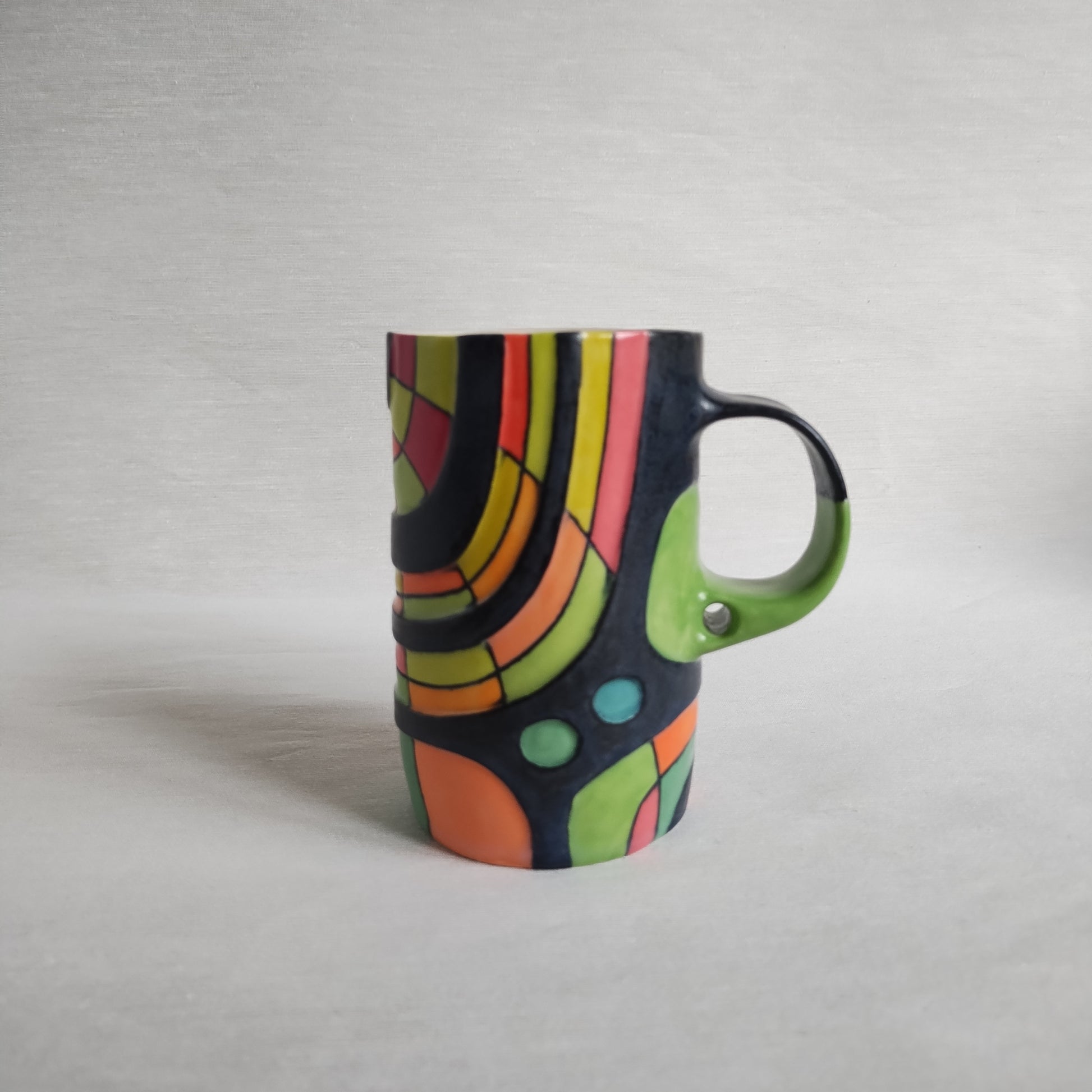 This unique handmade porcelain cappuccino mug is one of a kind. The embossed relief design heightens the tactile experience. Great for texture lovers! The outside surface is mindfully handpainted with underglazes in an abstract, graphic composition, detailed throughout with inlay (mishima). Satin clear glaze completes the final outer finish.
